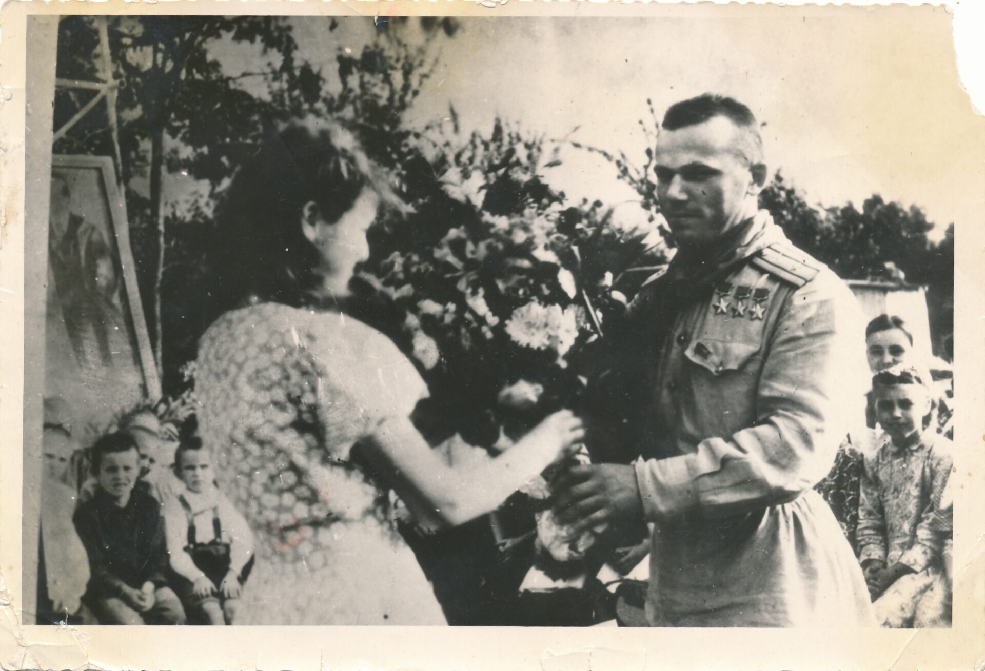 Почти все люди, попавшие в кадр, остались для нас инкогнито. Достоверно известно лишь то, что снимок был сделан в Тирасполе, а молодой советский офицер не кто иной, как легендарный летчик-ас, трижды Герой Советского Союза, тогда полковник, а в будущем маршал авиации Иван Никитович Кожедуб (8 июня 1920 – 8 августа 1991).
