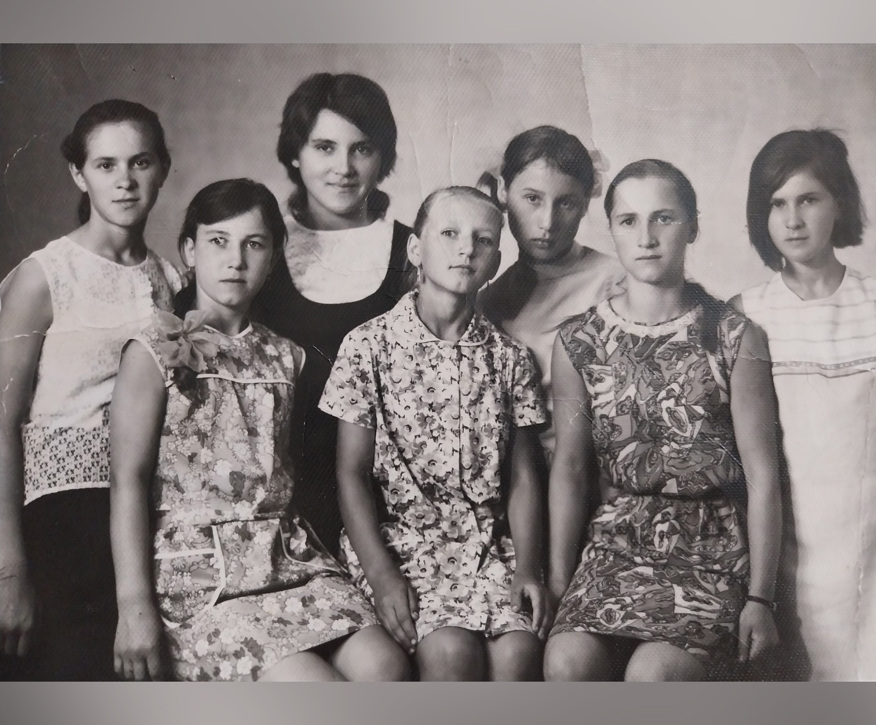 «На этот раз я хочу поведать о своей трудовой деятельности в школе. Начинали со сбора черешни, абрикосов, вишни. Запомнилось, как мы всей улицей шли утром на работу с вёдрами. Заходили за одноклассницами. Собирались на одной из остановок вместе со взрослыми женщинами, за нами приезжала грузовая машина с длинными скамейками. Мы залезали по железной лестнице в кузов, бросали свои сапки и вёдра и ехали в поле. По дороге на работу и обратно женщины всегда пели, шутили, а мы слушали и подпевали. Запомнились мне сами работницы в аккуратных ситцевых платочках, в платьицах, поверх которых обязательно были цветастые фартучки.