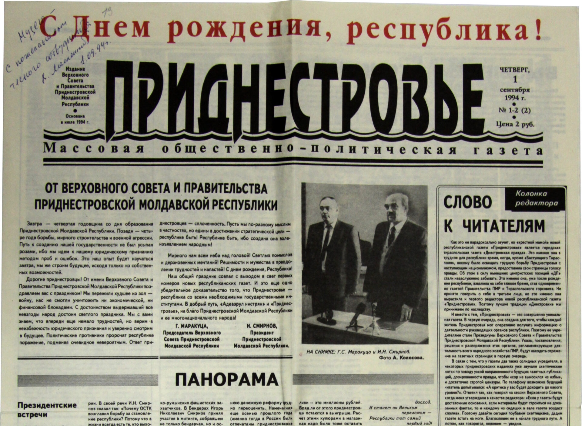 Владимиру Серафимовичу передавали предложения, звонили по телефону… Но все кончилось, когда через пару дней Масленников сказал: «Все, мне подсказали, и я согласился: газета будет называться «Приднестровье».