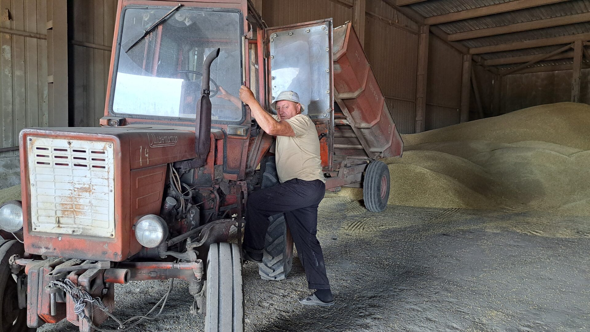 Успели уже убрать и озимый ячмень. С 50 гектаров – 350 тонн. Получается с гектара 70 центнеров. Это хорошая урожайность. Главный агроном Ольга Гроза показывает зерноток фирмы, его назначение – очистка, сушка и временное хранение зерна. Работники закончили чистку ячменя и его погрузку для хранения на зерноскладе с последующей реализацией. Он пойдёт на производство крупы, а также на корм животным, часть оставляют на семена. Для этого у фирмы есть зерноочистительная машина «Петкус», она отбирает качественное крупное зерно для будущих посевов. Потом проводят анализ на всхожесть, чтобы понять, подходят ли семена для посадки. Посевной материал покупают сельхозпредприятия со всей республики для засевания полей.