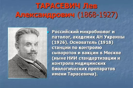 Среди них Николай Зелинский, Николай Склифосовский, Михаил Ларионов и многие другие. В этом ряду стоит и имя известного ученого-микробиолога, эпидемиолога и патолога Льва Тарасевича. С ним связано начало вакцинопрофилактики в России. 2 февраля исполняется 150 лет со дня рождения Льва Александровича. К этой знаменательной дате в одном из залов мемориального дома-музея ак. Н.Д. Зелинского открылась выставка, составленная из экспонатов фонда Тираспольского объединенного музея.