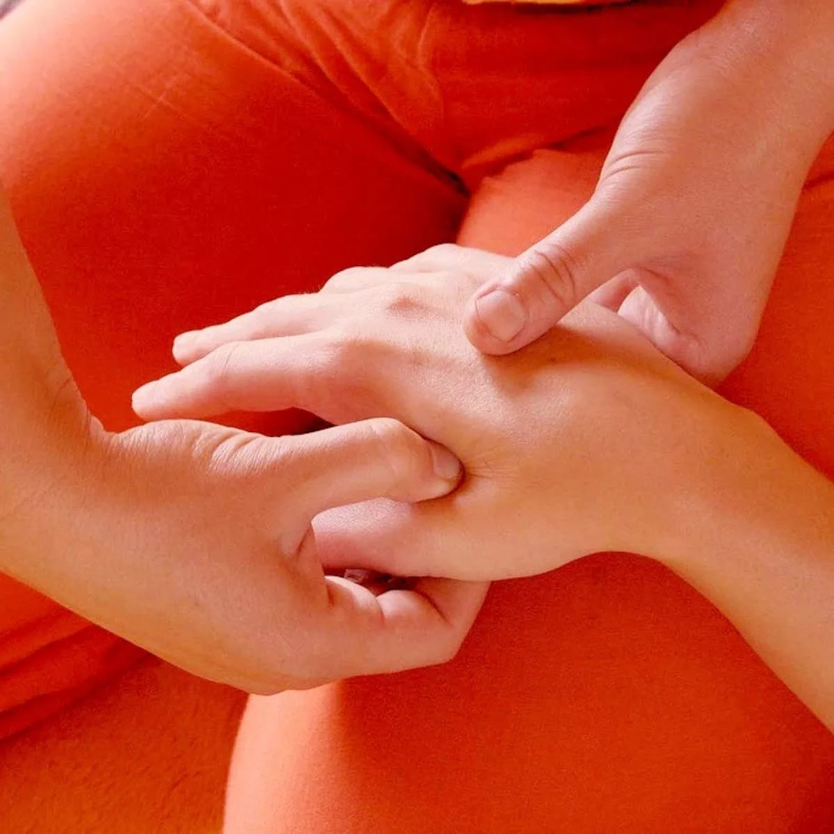 Закончите сеанс массажем точки в центре кожной складки, между косточками большого и указательного пальцев руки (она должна быть слегка болезненной при нажатии). Эту точку надо промассировать на обеих руках мягкими давящими движениями указательного и большого пальцев.