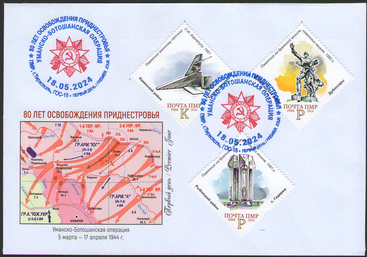 Недавно мы отметили 80-летие освобождения левобережной части нашей республики от нацистов и их союзников. В результате Уманско-Ботошанской операции не только был очищен от врага север Молдавской ССР, но Красная Армия впервые дошла и до довоенной границы Советского Союза и заняла плацдармы на территории страны – сателлита Третьего рейха Румынии. Именно Уманско-Ботошанской наступательной операции был посвящён новый почтовый выпуск, спецгашение которого прошло в здании столичного главпочтамта. Выпуск состоит из трёх миниатюр с изображением памятников воинам Красной Армии – лётчику-истребителю Семёну Ивановичу Хархалупу в селе Константиновка, уроженцем которого он был; монументы на братских могилах в Дубоссарах и селе Гидирим. На конверте первого дня представлена карта проведения Уманско-Ботошанской операции. Как отметил в интервью нашей газете директор «Марки Приднестровья» Всеволод Лаврентьев, вновь для приднестровских почтовых выпусков изготовлен двухцветный красно-синий штемпель спецгашения. Красным цветом на печати обозначен орден Отечественной войны. Тирасполь был одним из немногих советских городов, удостоенных этой награды первой степени.