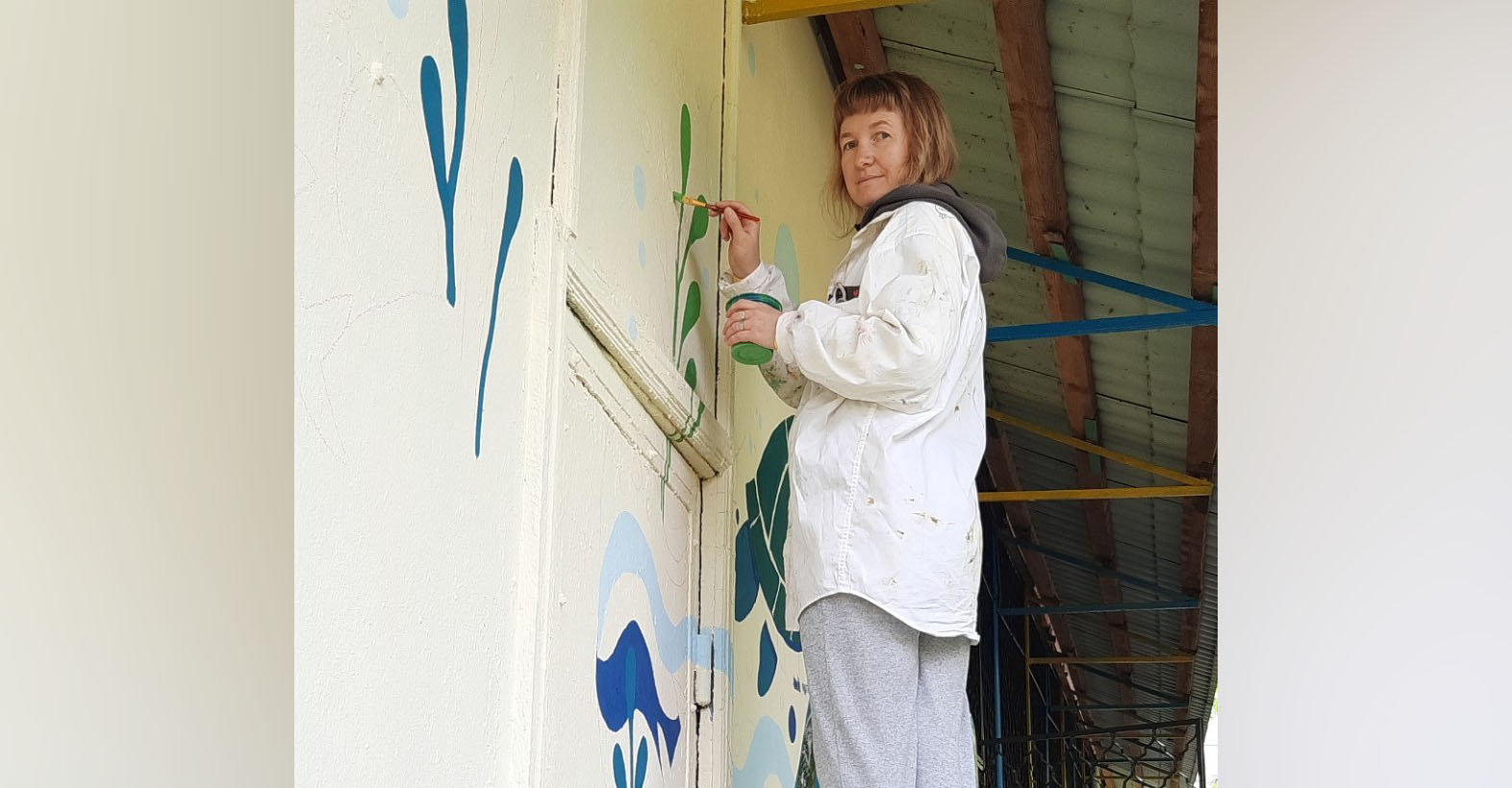 А стены – река с рыбками, черепахами, растениями и бликами. Внутри выпускницы художественной школы преподавателя Виктории Гороховой изобразили маяк на фоне заката. Очень достойный мурал! Мне помогали в росписи мои ученицы Полина и Славяна. Горжусь ими!