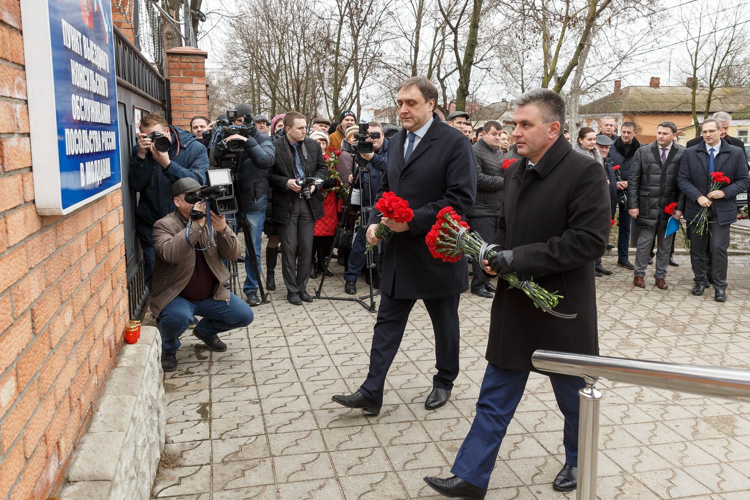 Президент Вадим Красносельский возложил цветы к зданию пункта выездного консульского обслуживания посольства России в Тирасполе.
