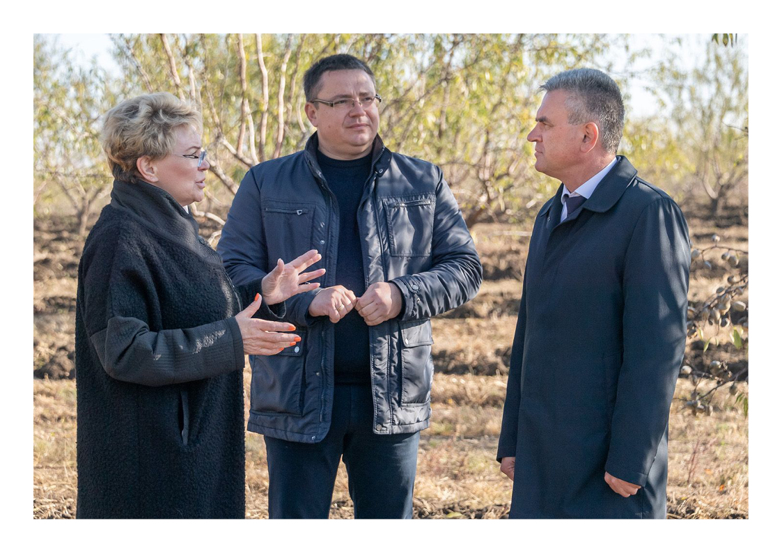 Особая гордость шипских аграриев – ореховый и миндальный сады (площадь – 10 и 16 гектаров соответственно). Вадим Красносельский бывал здесь на второй год после закладки сада. Тогда только делали прогнозы. В этот визит уже можно говорить об урожайности. Директор «Уотерхауса» Маргарита Яковлева рассказала, что одно дерево дает порядка 12 килограммов миндаля. Сейчас разгар уборочной кампании. Убрано около 60% садовой площади. Собрано 5 тонн продукции. Секрет хорошего урожая – дождливое лето. В засушливом 2020-м хозяйство потеряло 11% миндальных деревьев, которые в отличие от ореха плохо переносят дефицит влаги, поделился главный агроном предприятия Виталий Караман.