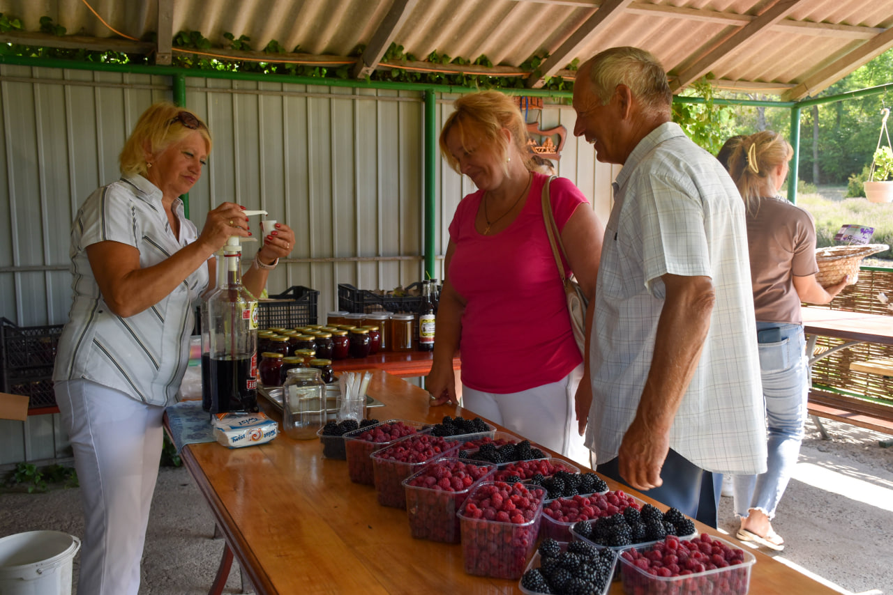 В этот день многие с удовольствием дегустировали ягодные варенья и настойки. Были пирожные и другая выпечка в тематическом стиле, виноград и ежевика, игровая программа и дискотека. Все прошло непринужденно, весело и без официоза, даже торжественная часть, во время которой вручили благодарственные письма от агентства по туризму главе госадминистрации района и города Владимиру Бычкову, начальнику районного управления культуры Виталию Лозовскому и Виктору Музыке. Представитель агентства Игорь Крыжановский отметил важность мероприятия в Год агропромышленного комплекса, сельских территорий и сельского туризма и подчеркнул, обращаясь к хозяину фазенды: «Подобных мест в республике больше нет. Продолжайте работу в данном направлении. Тем более, что желающих отдохнуть в этом чудесном и живописном уголке много. Насколько я знаю, записываться надо заранее». Кстати, туристов на фазенде было немало и в этот день. Нельзя не отметить выставку вязаных изделий образцового коллектива декоративно-прикладного творчества Дома культуры села Окница, который внес свою лепту в программу летнего праздника.