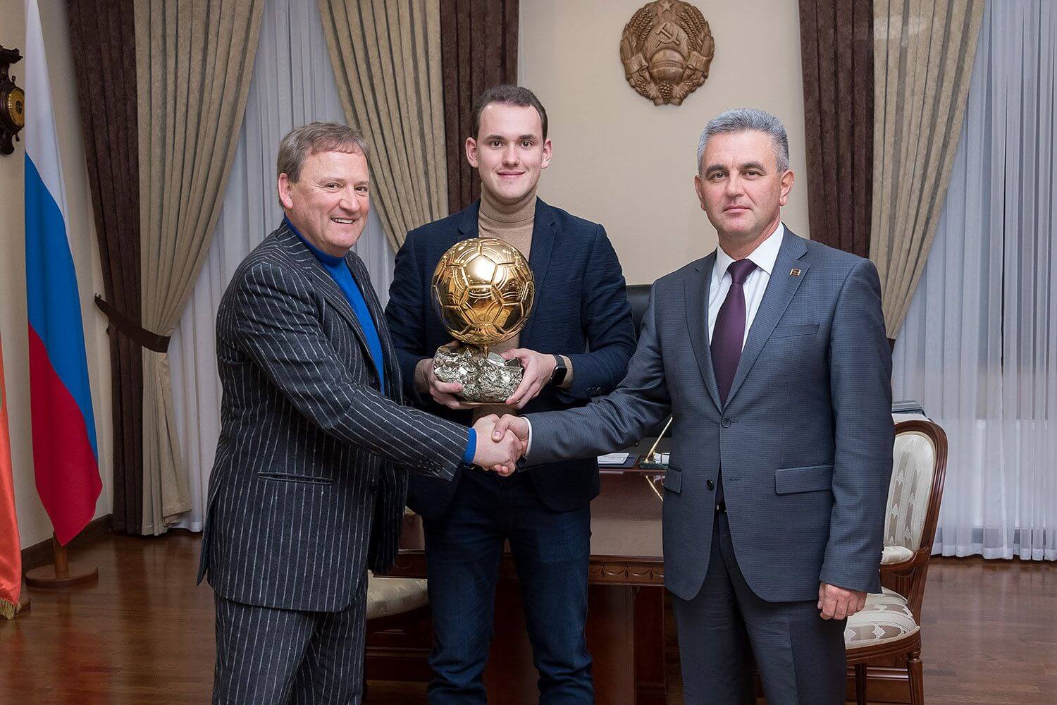 Трофей такого масштаба приехал в Тирасполь впервые. Привез его знаменитый обладатель Игорь Беланов, посетивший церемонию награждения лучших приднестровских футболистов 2019 года.
